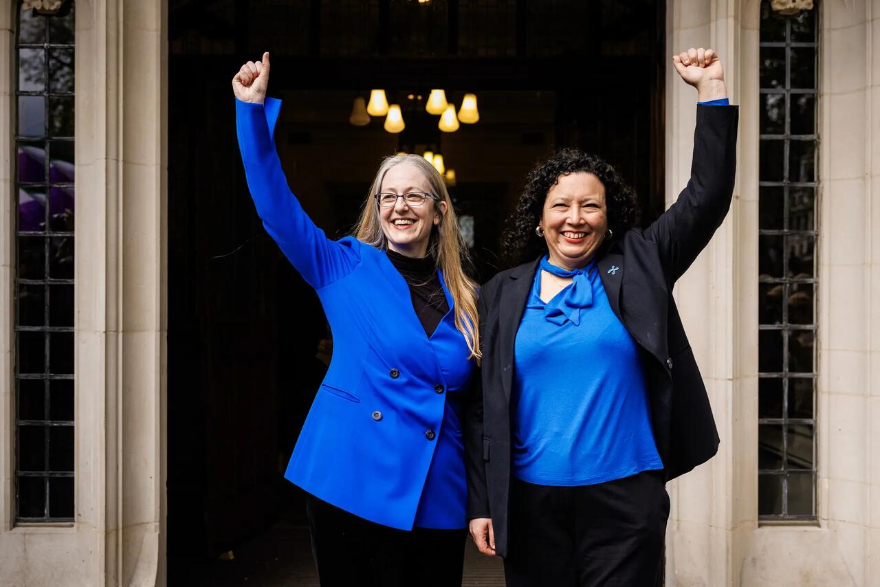 Celebrations outside the Supreme Court in London on April 16, 2025. The court ruled unanimously that “the terms woman and sex in the Equality Act 2010 refer to a biological woman and biological sex.” The decision allows men who identify as women, even with a gender recognition certificate, to be excluded from single-sex spaces. Dan Kitwood/Getty Images