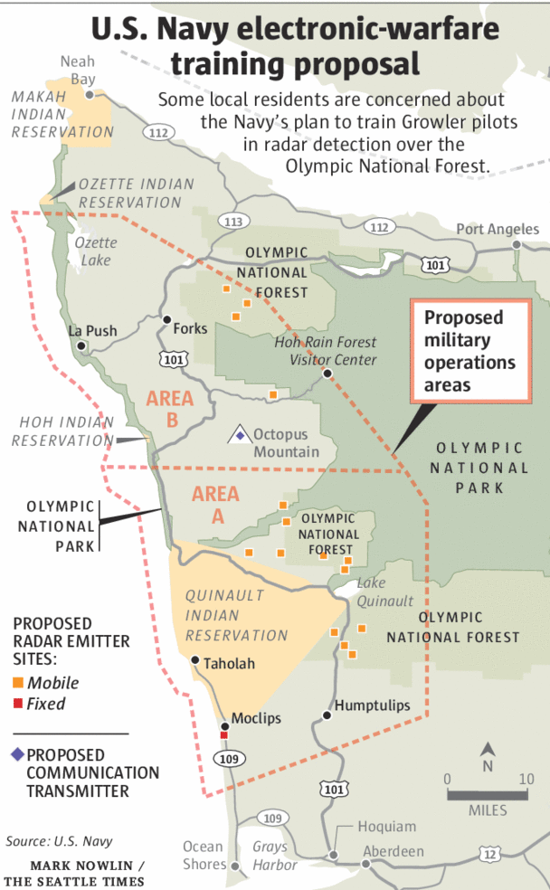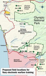 Updated September 2015: The US Navy plans to permanently use and periodically close large swathes of the Olympic National Forest, along with airspace over it and the Olympic National Park as well as the Olympic Coast National Marine Sanctuary, for electromagnetic warfare testing and training. They are also ramping up their use of explosives and sonar and training activities in the waters surrounding the Olympic Peninsula. Their stated goal is to turn the western portion of the Olympic Peninsula and surrounding waters into an Electromagnetic Warfare Range. This means electronic warfare will be practiced over our homes, public lands and waters, and massive sonar and explosive activity will occur in the rich waters surrounding Washington’s Olympic Peninsula, in perpetuity.