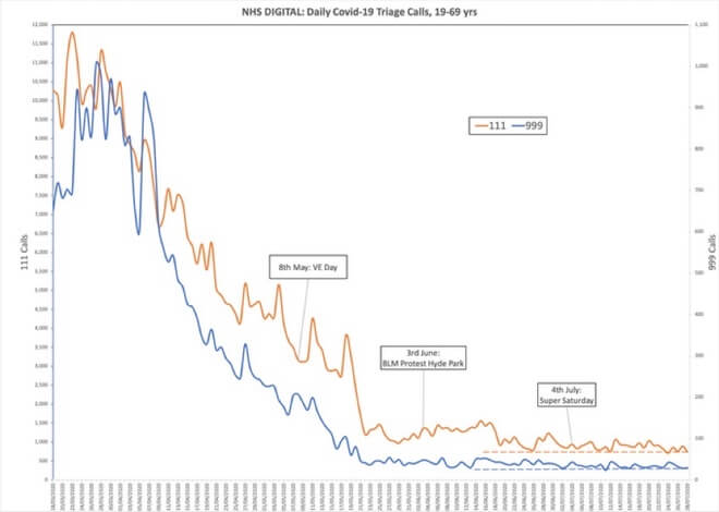 Your daily reminder that the virus has dwindled away to almost nothing. This graph shows daily triage calls for 19-69 year-olds. Note no uptick during the Hyde Park BLM protests or during the “major incident” on Bournemouth Beach. (Hat tip Alistair Haimes.)