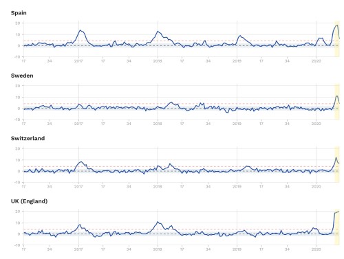 What the graphs on this page show us are patterns of excess mortality from ALL causes, over the past four years, in European countries. Here is the graph for Sweden, alongside those for Spain, Switzerland and England (only because these four were all together in the presentation.) I think this is useful to look at because it dispenses with any critique about non-Covid-19 deaths being counted as Covid-19 deaths. This (you can see graphs for all the countries here) simply shows us excess mortality from ALL causes, by country: