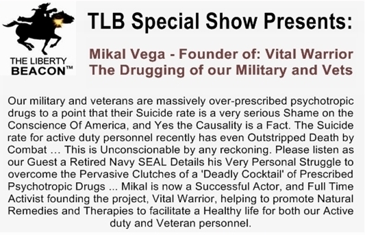 When more of our Military are dying from suicide than combat, and over 20 Vets a day commit suicide, with a very large number of them receiving psychotropic medication and drug cocktails by prescription … Something is very WRONG! Please listen to this vital show …