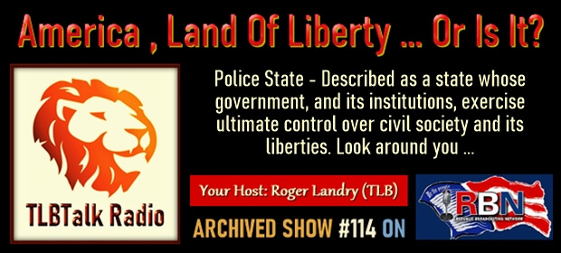 Hello again and welcome to Episode #114 of the TLBTalk Radio show on the Republic Broadcasting Network. Today’s title – America, Land Of Liberty … Or Is It? Let’s wind our way through the chaos and tyranny … But first let’s get through this intro routine …