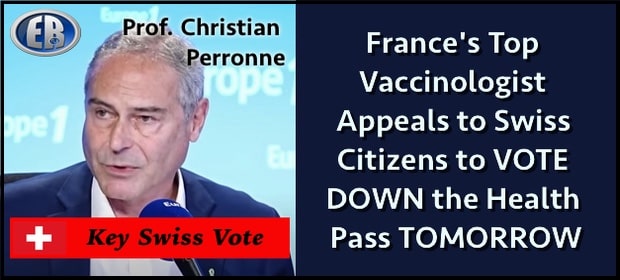Prof. Christian Perronne is a huge name in medicine and vaccinology in France and beyond. See this interview he did with UKColumn back in July, which also gives his distinguished background. He’s been thoroughly persecuted for his honest, science-based views about the plandemic in France, and came out a while back saying it’s the vaccinated that need quarantining. Remarkably, he was recently allowed back on mainstream TV at the behest of journalist Ivan Rioufol. Below in a letter to the Swiss people, he addresses the importance of the referendum taking place tomorrow.