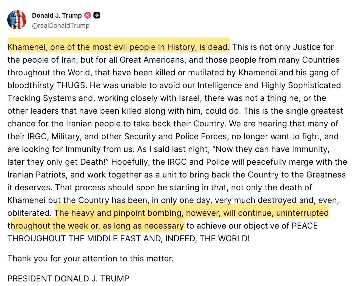 Khamenei Dead or Alive: Adding to the mystery, Khamenei’s X account has posted something ambiguous just after Trump’s statement. Trump has further vowed the bombing will continue: