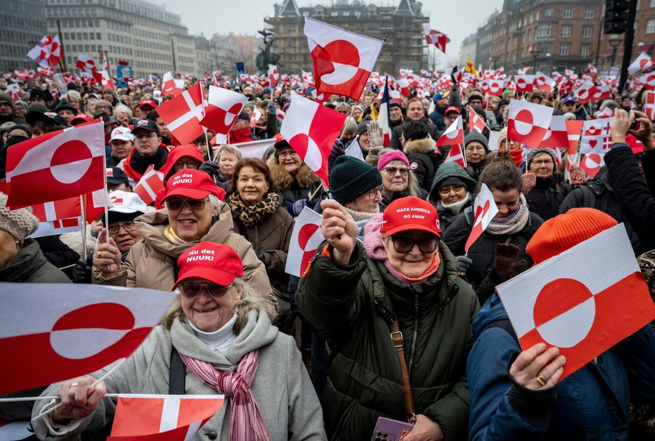 Meanwhile in Nuuk, the capital of Greenland, thousands of people, including the territory’s prime minister, Jens-Frederik Nielsen, waved Greenlandic flags, chanted slogans and sang traditional Inuit songs under light rain.