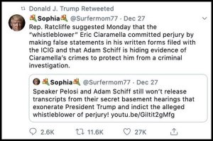 “Rep. Ratliffe suggested Monday that the “whistleblower” Eric Ciaramella committed perjury by making false statements in his written forms filed with the ICIG and that Adam Schiff is hiding evidence of Ciaramella’s crimes to protect him from criminal investigations,” read the tweet made by by now-banned @surfermom77, which describes herself as living in California and a “100% Trump supporter.”