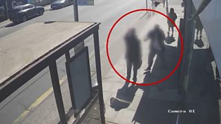 More CCTV footage – timestamped to 11:20 BST – shows the suspect approaching a bus stop and repeatedly attacking a man waiting there, who he then pushes on to the road and out of view.
