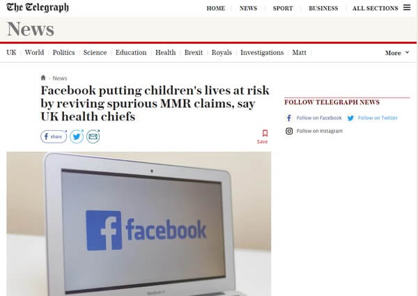 A UK daily newspaper, The Daily Telegraph, published an article today with UK health chiefs effectively calling for Facebook to censor anyone that challenges the mainstream view on vaccines. It focused on the MMR vaccine and measles.