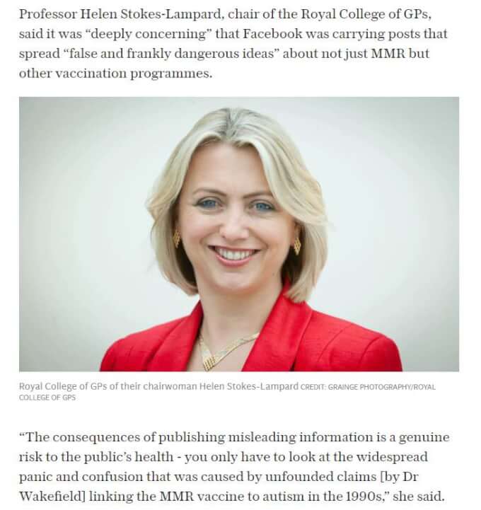 The article quotes Professor Helen Stokes-Lampard, Chair of the Royal College of GPs, who is deeply concerned that Facebook was allowing “false and frankly dangerous ideas” about MMR and other vaccines to be spread over the internet.