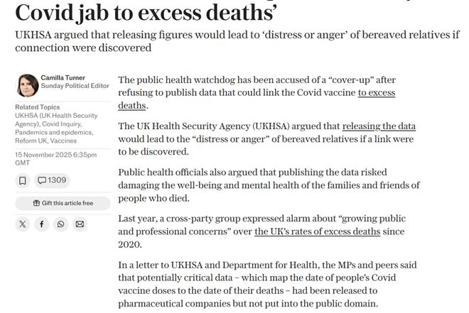 Today,The Telegraph revealed that the UK Health Security Agency (UKHSA) has refused to publish anonymized data that would likely show strong evidence of a link between COVID-19 “vaccines” and mass deaths.