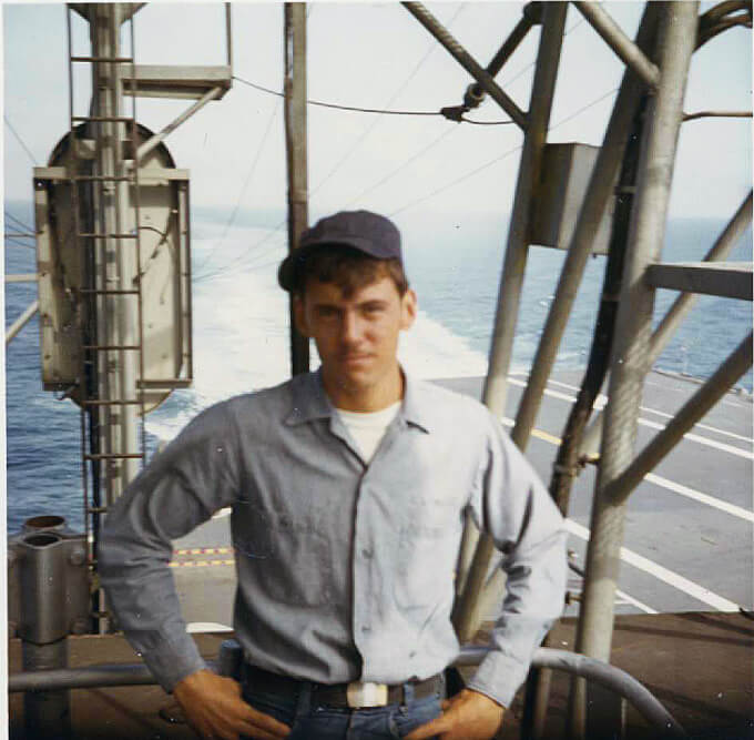 Ken watching flight operations from the Conning Tower of The USS Kitty Hawk, 1969