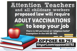 SB792 mandates SEVEN vaccines – TDap, MMR and Flu – for ALL daycare and preschool workers, including head start, early childhood centers, private school nurseries, and after school programs – WITHOUT personal belief exemptions as a condition of employment.