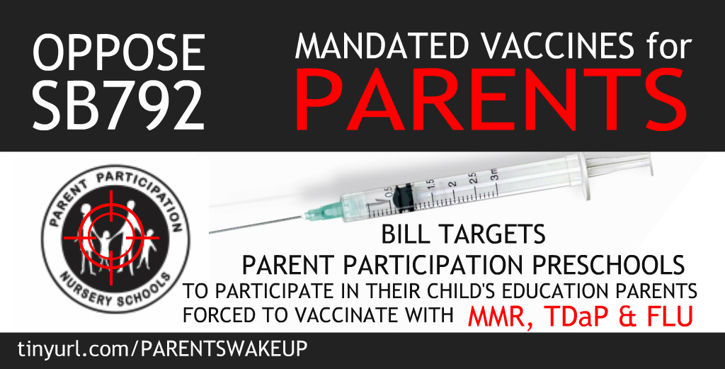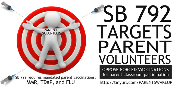 On September 4, 2015, bill author Senator Mendoza added a last minute amendment expanding this vaccine mandate to now include parents who volunteer at their children’s daycare facilities including State licensed home based daycare. Pre-schools and even parent co-ops if monies are exchanged will not be exempt from SB792. This new mandate would also apply to head start, early childhood centers and private school nurseries, and after school programs. If you are a parent or grandparent who wants to volunteer your time, talents and skills to benefit your children and their classmates educational experience, you will have to roll up your sleeve or be denied access.