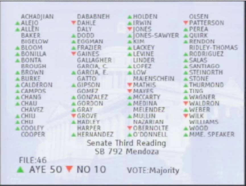 The following shows the SB792 Assembly Floor Vote today, September 8th, 2015. It passes 50-10 with No opposition on the floor. It goes back to the Senate for a rubber stamp on the Assembly Amendments as early as tomorrow …