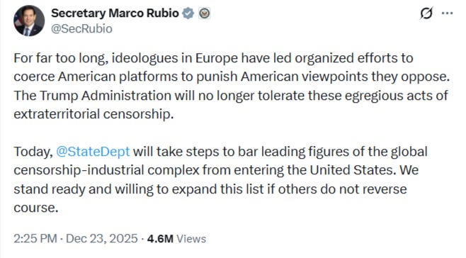 The US State Department will bar entry to several Western Europeans it has accused of pressuring American technology platforms to suppress US viewpoints, Secretary of State Marco Rubio has said.