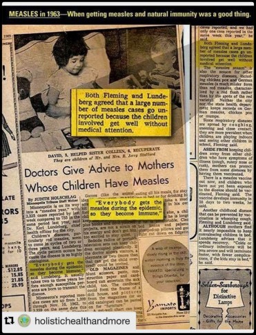 The next image is from a newspaper in the late 60s and in my opinion it is historically significant because if you look closely you can see that they are saying measles is a mild disease but they are also recommending the new vaccine-classic medical double speak! There is a great explanation of how real heard immunity works, not the less than truthful version used to push vaccines.