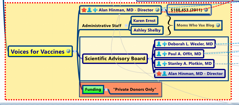 Alan Hinman is the director for various positions within the Task Force, including his leadership role for the Voices for Vaccines website. The IRS Form 990 for 2011 states he was paid $188,453 for his work. While the program Voices for Vaccines may not accept funding from pharmaceutical companies or government grants, he has his fingers in other pots that do.