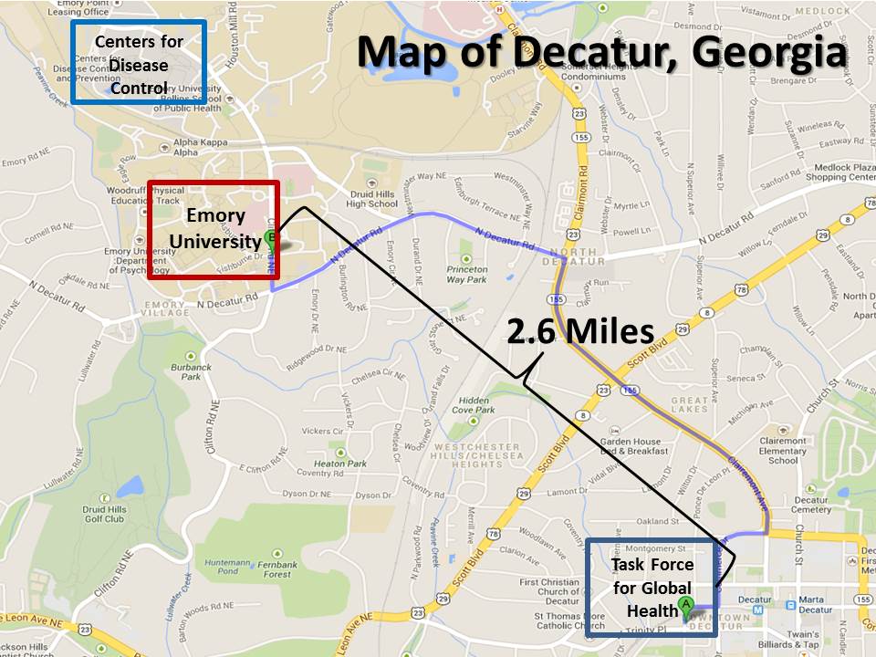 Let’s take a look at how closely the following three organizations are connected to each other. According to Google Maps, the Task Force for Global Health is located 2.6 miles from Emory University, and the Centers for Disease Control are located on essentially the same campus.