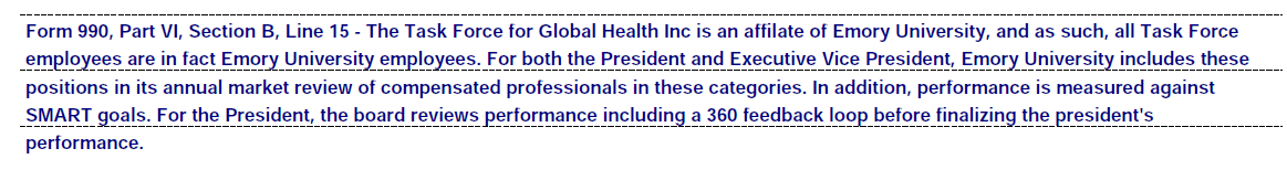 Page 49 of their 2011 document states, “The Task Force for Global Health Inc. is an affiliate of Emory University, and as such, all Task Force employees are in fact Emory University employees. For both the President and Executive Vice President, Emory University includes these positions in its annual market review of compensated professionals in these categories …” [4]