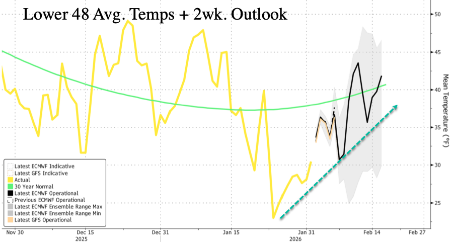 (ZH) – Update – US natural gas futures tumbled on Monday as the latest weather models pointed to warmer conditions across the Lower 48, following several miserable weeks of winter that sent NatGas spot prices soaring due to freeze-offs and spiking power prices amid surging heating demand.