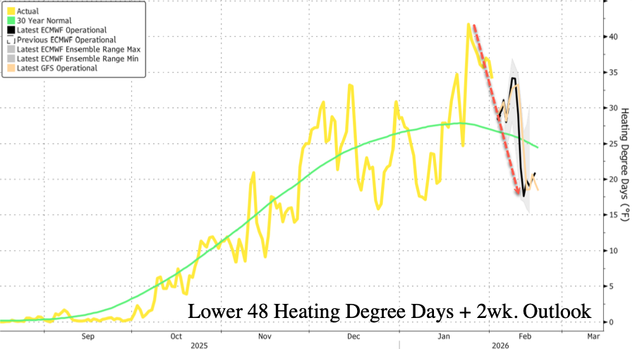 Heating degree days, a measure of how cold the weather is and how much energy is needed to heat homes and businesses, have plunged from north of 40 to about 35, with a two-week outlook showing sub-20s by mid-month. The translation is simple: warmer weather means less heating demand, so utilities burn less NatGas.