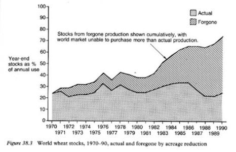 I’d like for you, for just a few seconds, to take a look at two graphs, which I pulled out of Julian Simon’s The State of Humanity. The first graph shows how much wheat is not grown, because our production capacity is so much greater than our demand for wheat.