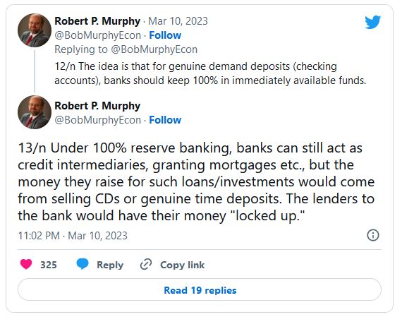 Similarly, economist Robert Murphy has proposed a full reserve system which doesn’t require yearly fees and allows for lending by having depositors agree to lock in their funds for a specific amount of time which matches with the loan maturity.