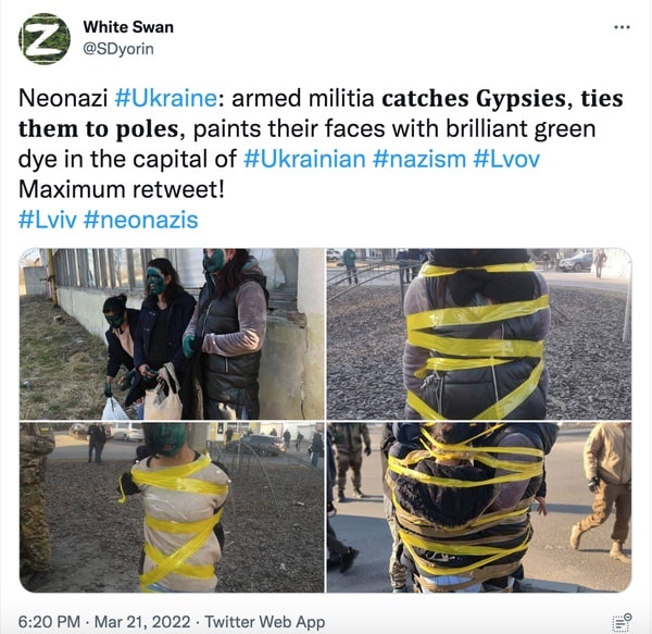 The breakdown of society in #Ukraine: Romany family tied to a pole in #Lvov. #Lviv #Kiev #Biden #BidensWar #racism #fascism #UkraineFailedState #Roma pic.twitter.com/hnm5j2eRxy