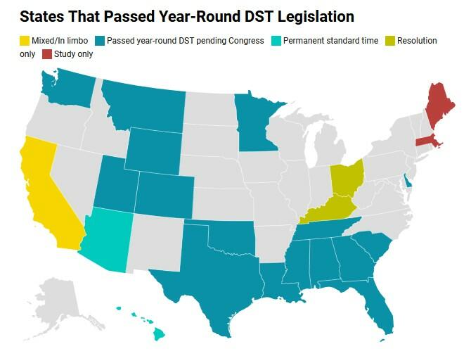 Almost every state in the union has considered some legislation in the last few years that would lock the clocks on either standard or daylight saving time. Currently, by federal law, states are not allowed to lock the clock on daylight saving time.