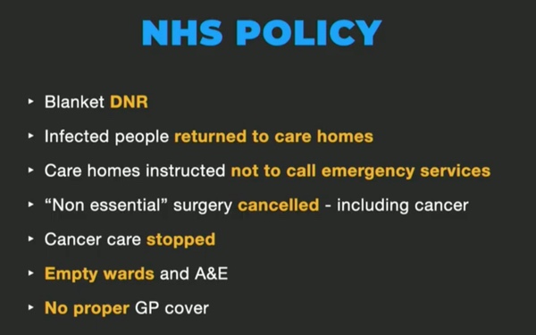Blanket DNR (do not resuscitate) orders were given by NHS as a policy; infected covid patients were sent back to care homes; care homes were instructed not to contact emergency services; non-essential surgery and cancer surgery/treatment were all cancelled – many hospital wards & departments were empty; there was no proper GP (family doctor) cover.