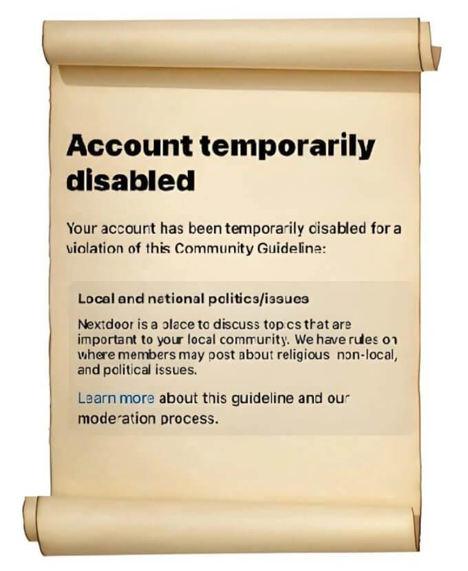 I was recently removed by the right, honorable NextDoor! For those of you not aware, NextDoor is a rather mundane social media contraption that purports to be well . . . Next Door. It’s business model is a family place for lost dogs and things about the neighborhood that may be of interest to those looking to connect with others in the ‘hood who are as bored as they are.