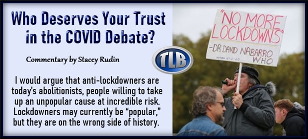 Ask yourself, who deserves your trust? I would argue that anti-lockdowners are today’s abolitionists — people willing to take up an unpopular cause at incredible risk. Lockdowners may currently be “popular,” but they are on the wrong side of history.