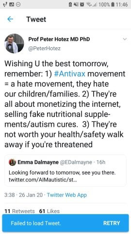 This time she received specific guidance from travelling vaccine promoter Peter Hotez, who advised Dalmayne to portray the filmmakers and others who advocate for vaccine safety, as members of a “hate group.”