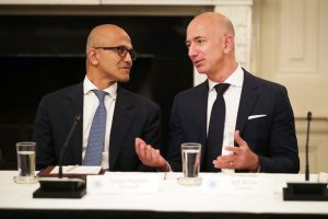 Microsoft CEO Satya Nadella, left, and Amazon CEO Jeff Bezos are targets of employee petitions against certain company contracts. Chip Somodevilla/Getty Images