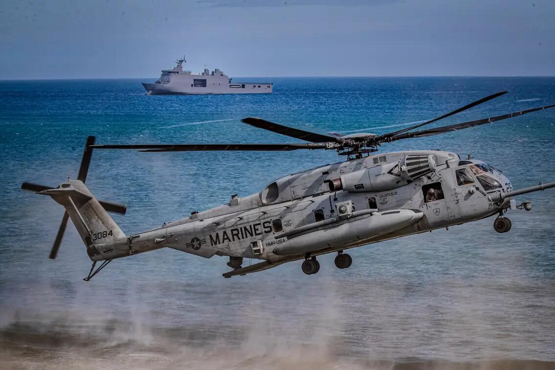 A U.S. Marine CH53 helicopter takes off during a joint U.S.–Philippines war exercise off the waters of South China Sea in Claveria, Cagayan Province, Philippines, on March 31, 2022. (Ezra Acayan/Getty Images)