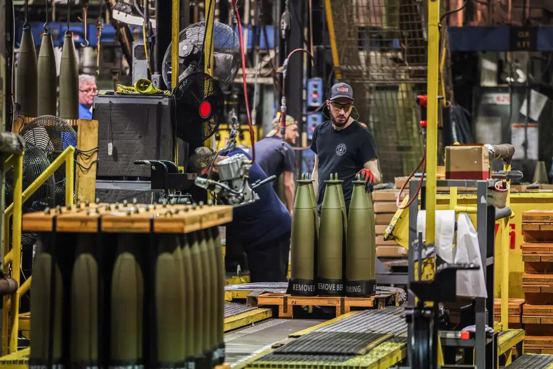 A worker prepares 155 mm caliber shells for shipment at the Scranton Army Ammunition Plant in Scranton, Pa., on April 16, 2024. (Charly Triballeau/AFP via Getty Images)
